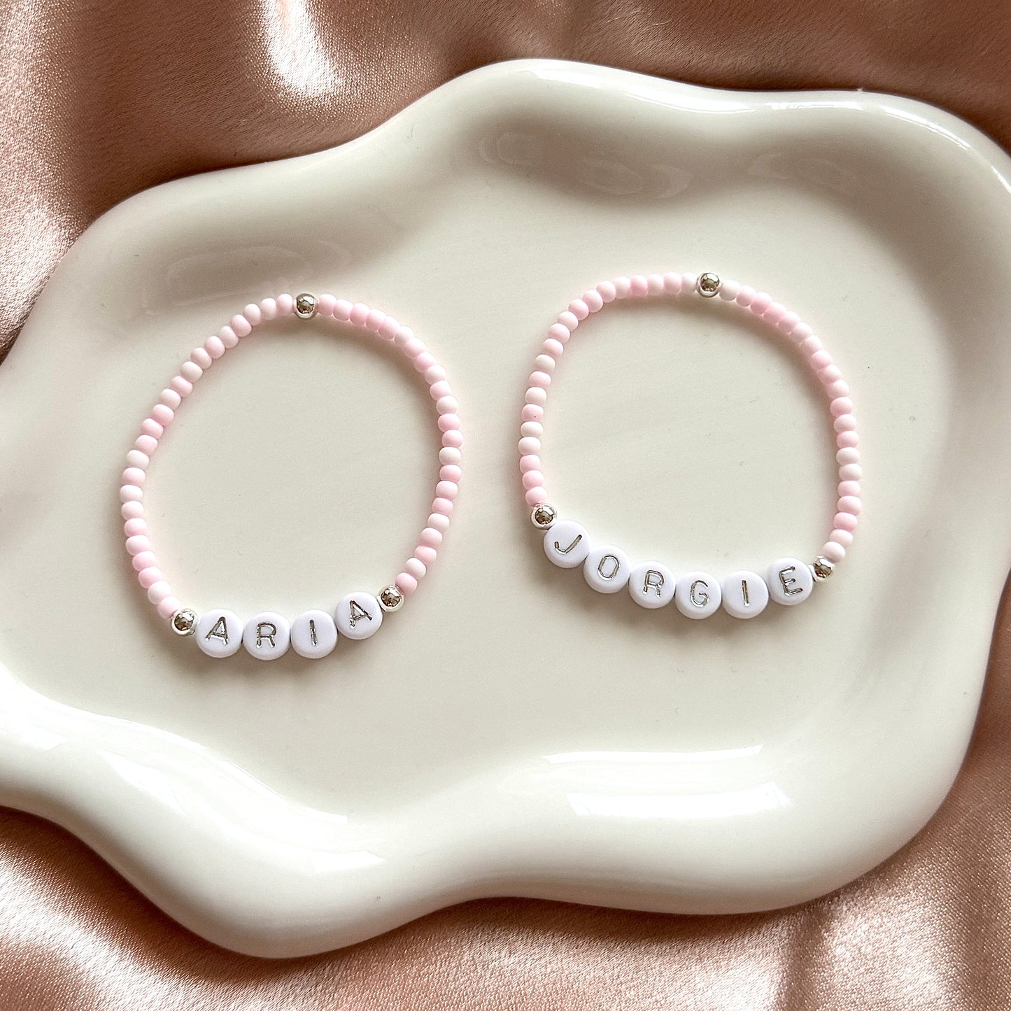 Colourful beaded bracelet made with 3mm seed beads. Available in 5 soft pastel colourways. Choose from gold or silver accents and lettering.