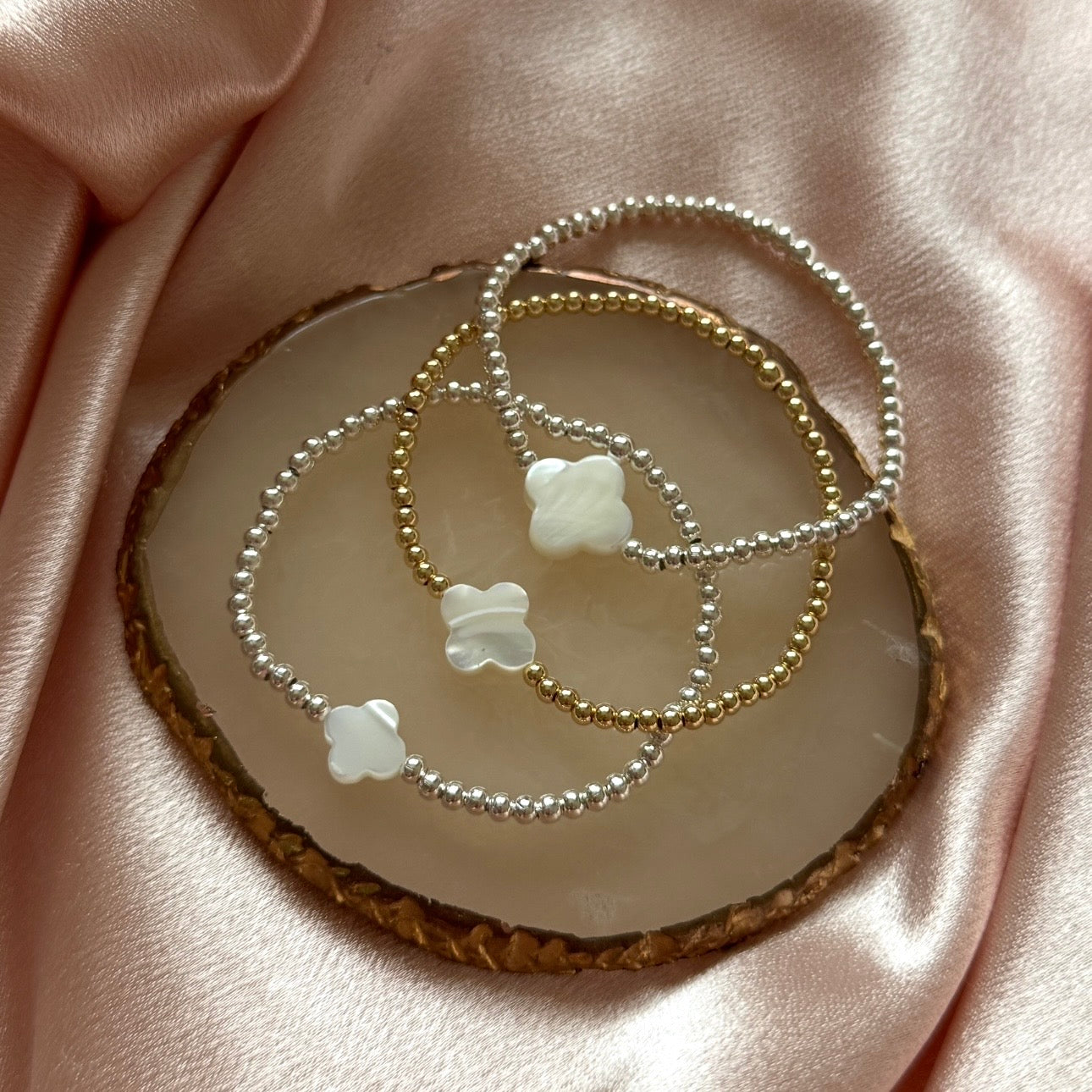 A timeless bracelet that adds effortless elegance to any stack. The Alex Clover Bracelet features delicate 3mm gold or silver beads, in your choice of plated or luxe finish, paired with a luminous mother-of-pearl clover charm in 10, 12 or 15mm — each one naturally unique with its own gentle shimmer.