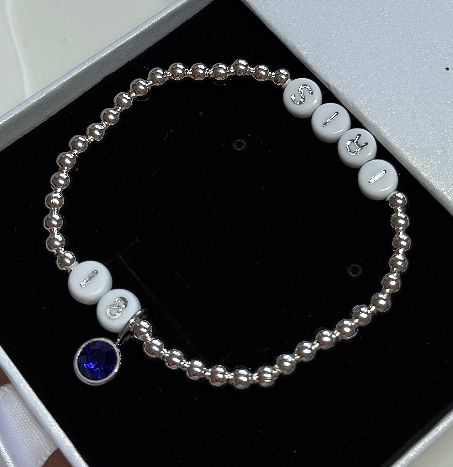 This bracelet is custom made with your chosen birth date in black and white, gold, or silver letter beads, finished with a sparkling stainless steel crystal birthstone charm. Choose between gold or silver plated beads — each bracelet is strung on strong elastic for easy everyday wear.