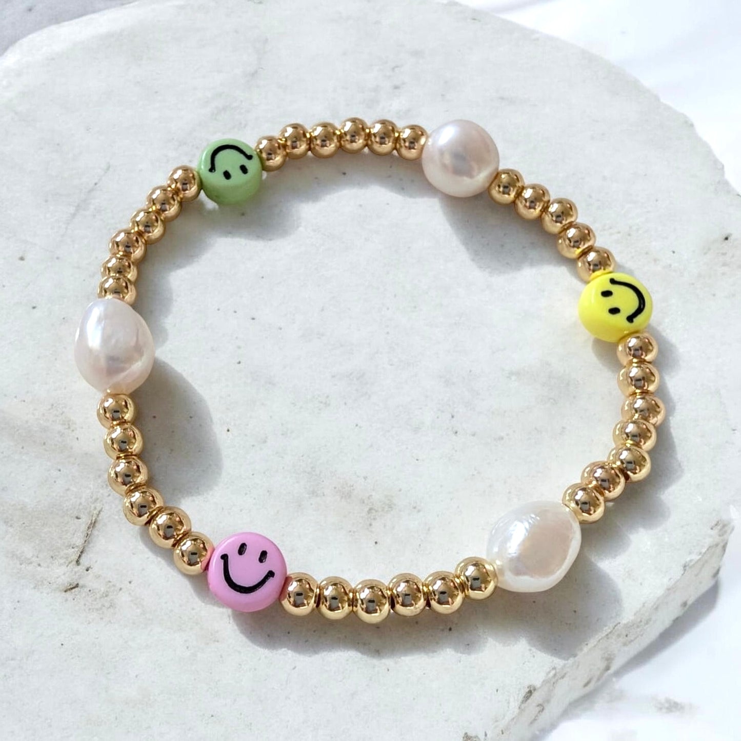 Stretch bracelet made with gold or silver plated beads, colourful smiley faces and freshwater pearl-style beads. Option to upgrade finish to tarnish-resistant 925 sterling silver or 14kt gold filled.